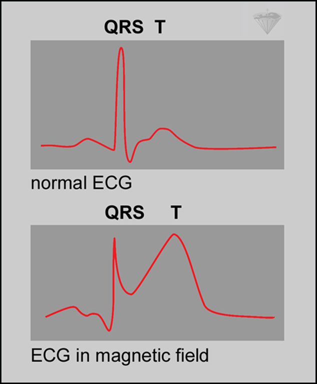 Flowing blood can behave as a moving conductor in a magnetic field. The field can induce a voltage that will be highest during the part of the cardiac cycle with the fastest blood velocity. This coincides with the T-wave of the ECG and enhances the T-wave, potentially mimicking pathology.